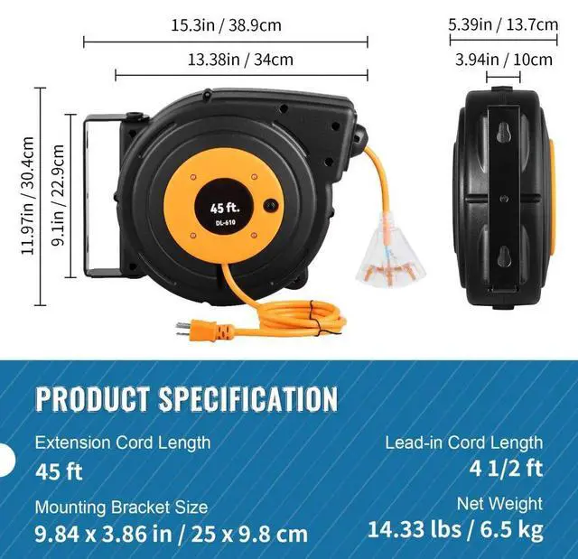 Extension Cord Length: 45 ft,Indoor/Outdoor Use: Indoor,Material: Polypropylene,Circuit Breaker: 15A,Certification: UL Listed,Max. Watts: 1875W,Max. Amps: 15A,Item Dimensions(L x W x H): 13.38 x 11.97 x 5.39 in /34 x 30.4 x 13.7 cm,Lighted Plug: DL-31/DL-523C,Max. Voltage: 125V 60 Hz,Mounting Bracket Size(L x W): 9.84 x 3.86 in / 25 x 9.8 cm,Model: CR123OW45FT,Lead-in Cord Length: 4 1/2 ft,Cord Gauge: 12AWG/3C,Cord Type: SJTOW,Net Weight: 14.33 lbs / 6.5 kg