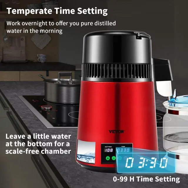 VEVOR 1.1Gal Water Distiller, 0.3Gal/H, 750W Distilled Water Maker Machine 0-99H Timing Setting Temp Display, 304 Stainless Steel Countertop Distiller Glass Carafe Cleaning Powder 3 Carbon Packs, Red