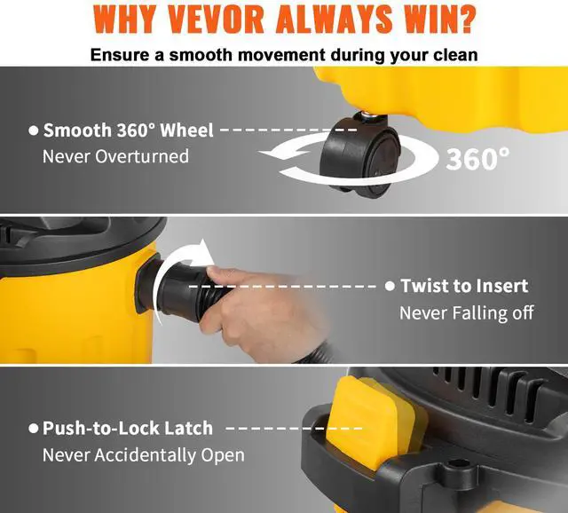 VEVOR Wet Dry Vac, 2.6 Gallon, 2.5 Peak HP, 3 in 1 Shop Vacuum with Blowing Function, Portable with Attachments to Clean Floor, Upholstery, Gap, Car, ETL Listed, Yellow