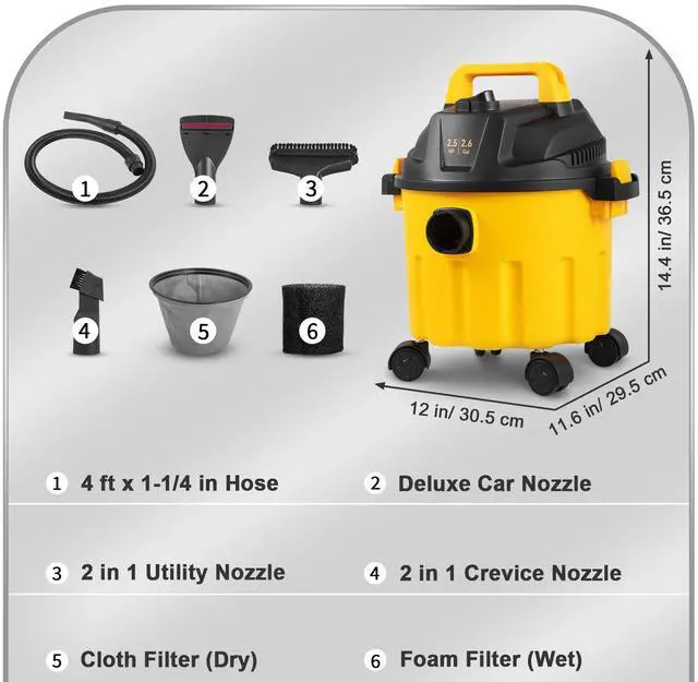 Power Cord Length: 10 ft / 3 m,Noise Level: 77dB,Tank Capacity: 2.6 Gallon / 10 L,Horsepower: 2.5 Peak HP,Voltage: 110-120 V / 60 Hz,Model: VV-GSXCQ-10L,Hose Size: 1-1/4 in x 4 ft / 32 mm x 1.2 m,Power: 800 W,Item Weight: 7.1 lbs / 3.2 kg