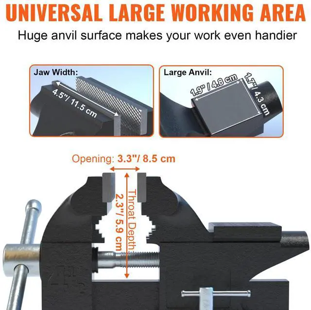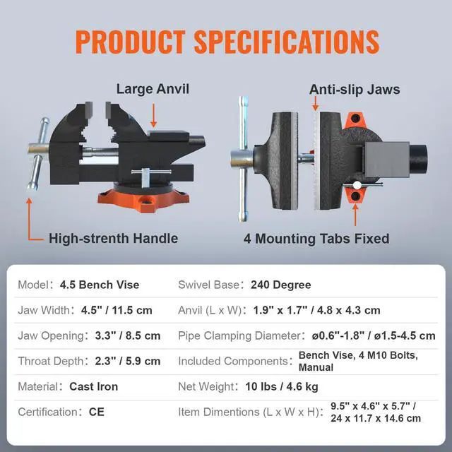 Swivel Base: 240 Degree,Jaw Width: 4.5" / 11.5 cm,Item Dimensions (L x W x H): 9.5" x 4.6" x 5.7" / 24 x 11.7 x 14.6 cm,Throat Depth: 2.3" / 5.9 cm,Model: 4.5 Bench Vise,Anvil Size (L x W): 1.9" x 1.7" / 4.8 x 4.3 cm,Pipe Clamping Diameter: 0.6"-1.8" / 1.5-4.5 cm,Jaw Opening: 3.3" / 8.5 cm,Material: Cast Iron,Net Weight: 10 lbs / 4.6 kg,Certification: CE