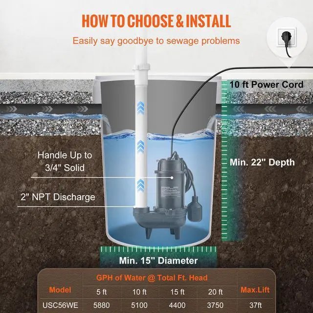 Amps: 10 A,Power Cord Length: 10 ft / 3 m,House Power: 3/4 HP,Max. Flow: 98 GPM,Input Power: 1050 W,Voltage: 120V 60HZ,Protection Type: IPX8,Model: USC56WE,Max. Lift: 37 ft/11 m,Water Temperature: 32-95 / 0-35