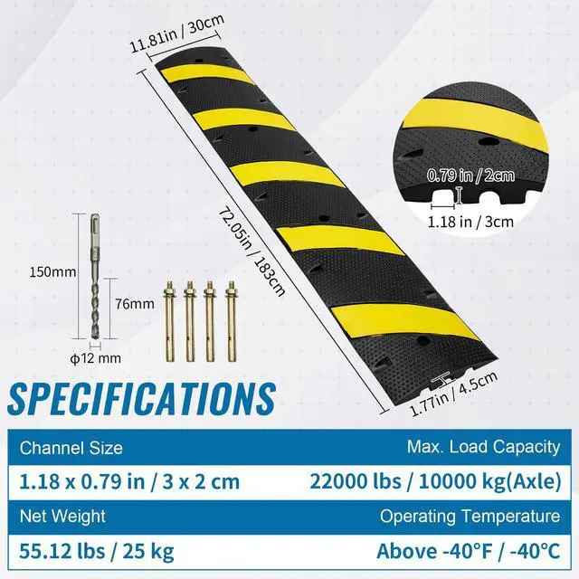 Operating Temperature: Above -40 / -40,Gross Weight: 59.52 lbs / 27 kg,Packing Size(L x W x H): 72.83 x 12.6 x 2.36 in / 185 x 32 x 6 cm,Amount: 1 PC,Channel: 2,Channel Size(W x H): 1.18 x 0.79 in / 3 x 2 cm,Color: Black + Yellow,Model: RS1830A-1,Maximum Load Capacity: 22000 lbs / 10000 kg(per axle),Product Dimensions(L x W x H): 72.05 x 11.81 x 1.77 in / 183 x 30 x 4.5 cm,Net Weight: 55.12 lbs / 25 kg,Main Material: Rubber