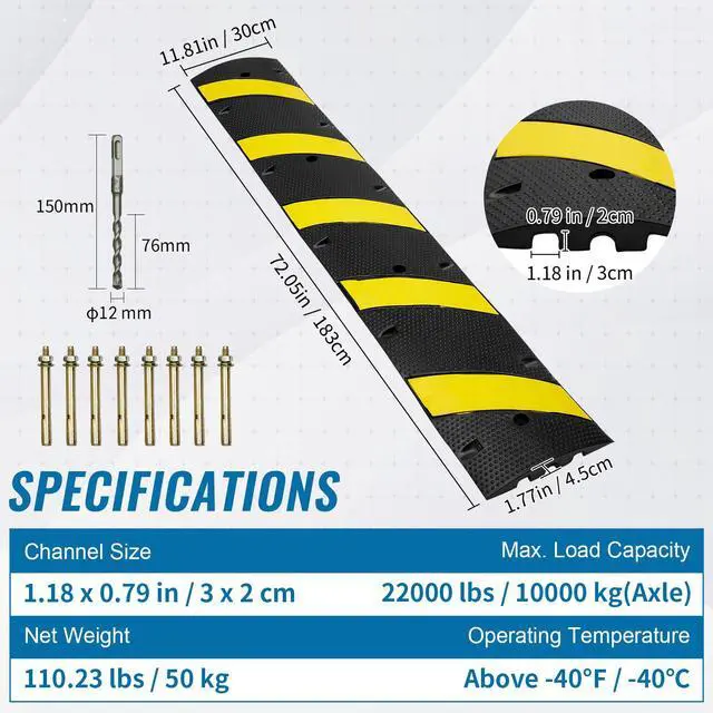Operating Temperature: Above -40 / -40,Gross Weight: 114.64 lbs / 52 kg,Packing Size(L x W x H): 72.83 x 12.6 x 4.53 in / 185 x 32 x 11.5 cm,Amount: 2 PCs,Channel: 2,Channel Size(W x H): 1.18 x 0.79 in / 3 x 2 cm,Color: Black + Yellow,Model: RS1830A-2,Maximum Load Capacity: 22000 lbs / 10000 kg(per axle),Product Dimensions(L x W x H): 72.05 x 11.81 x 1.77 in / 183 x 30 x 4.5 cm,Net Weight: 110.23 lbs / 50 kg,Main Material: Rubber