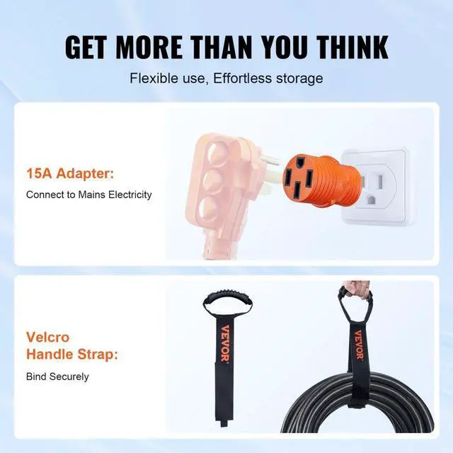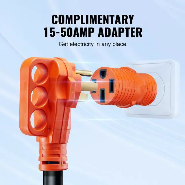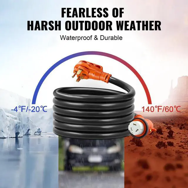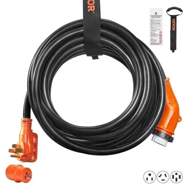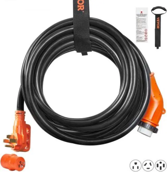 Package Dimensions(L x W x H): 15.4 x 15 x 4.9 in / 39 x 38 x 12.5 cm,Operating Temperature: -4F to 140F/-20 to 60,Voltage: 125V / 250V,Model: RVX-50A30FT,Product Length: 30 ft / 9.1 m,Female Plug: NEMA SS2-50R,Male Plug: NEMA 14-50P,Current: 50A,Wire Gauge: 3*6AWG+1*8AWG, STW,Net Weight: 21.3 lbs / 9.7 kg,Power: 6250W / 12500W