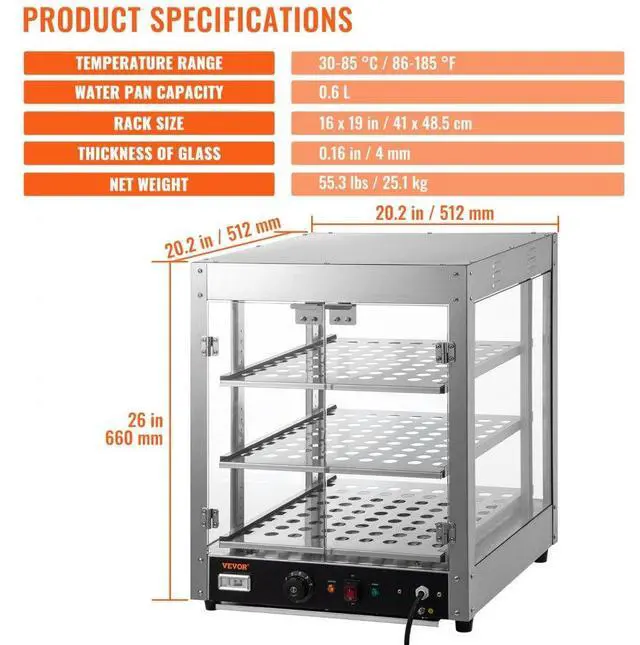 Power Cord Length: 59 in / 150 cm,Voltage: 120 V,Model: BWG-M,Temperature Range: 30-85 C / 86-185 F,Material: Stainless Steel,Item Dimensions: 20.2 x 20.2 x 26 in / 51.2 x 51.2 x 66 cm,Water Tray Capacity: 0.6 L,Power: 800 W,Thickness of Glass: 0.16 / 4 mm,Item Weight: 55.3 lbs / 25.1 kg