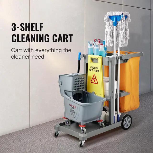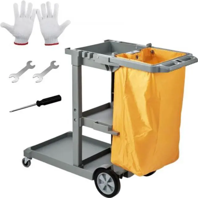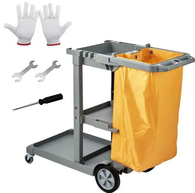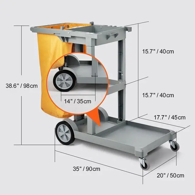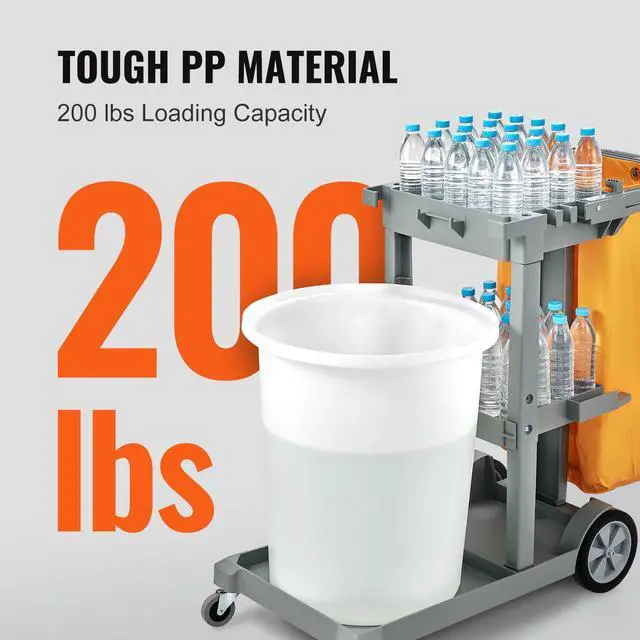 Type: 3-shelf Cleaning Cart,Volume of Garbage Bag: 25 Gallons/94.6 L,Capacity: 200 lbs/90.7 kg,Material of Bag: PVC,Material of Cart: PP,Item Weight: 27 lbs/12.2 kg,Product Dimensions (D x W x H): 47" x 20" x 38.6"/120 x 51 x 98 cm