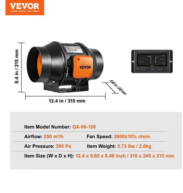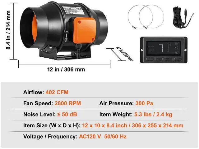 Airflow: 402 CFM,Noise Level: 50 dB (About 32 dB),Item Size (L x W x H): 12 x 10 x 8.4 in / 306 x 255 x 214 mm,Motor Type: Copper Motor,Model: VV-GDFJ-EC6,Air Pressure: 300 Pa,Rated Power: 38 W,Fan Speed: 2800 RPM,Item Weight: 5.3 lbs / 2.4 kg,Voltage / Frequency: AC 110V-240V, 50/60Hz