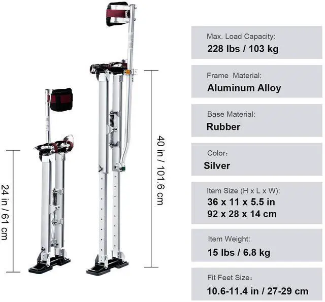 Item Size (H x L x W): 36 x 11 x 5.5 in / 92 x 28 x 14 cm,Adjustable Height: 24-40 in / 61-101.6 cm,Color: Silver,Model: YSSGBGQ-2440,Max. Load Capacity: 228 lbs / 103 kg,Frame Material: Aluminum Alloy,Fit Feet Size: 10.6-11.4 in / 27-29 cm,Item Weight: 15 lbs / 6.8 kg,Base Material: Rubber