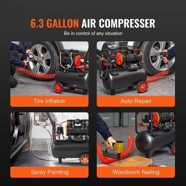 Protection Temperature: 302 / 150,Weight: 47.4 lbs / 21.5 kg,Product Size: 25.2 x 13 x 28.7 in / 64 33 73 cm,Noise Level: 70 dB,Flow Rate: 3.35 CFM@ 90PSI,Tank Capacity: 6.3 Gallon / 24 L,Motor Speed: 3500 RPM,Working Pressure: 87-116 PSI / 6-8 Bar,Maximum Bearing Pressure: 3.5 Mpa,Voltage: AC120V 60Hz,Motor Type: Oil-free Motor,Working Temperature: -59-104,Power: 2 HP / 1450 W