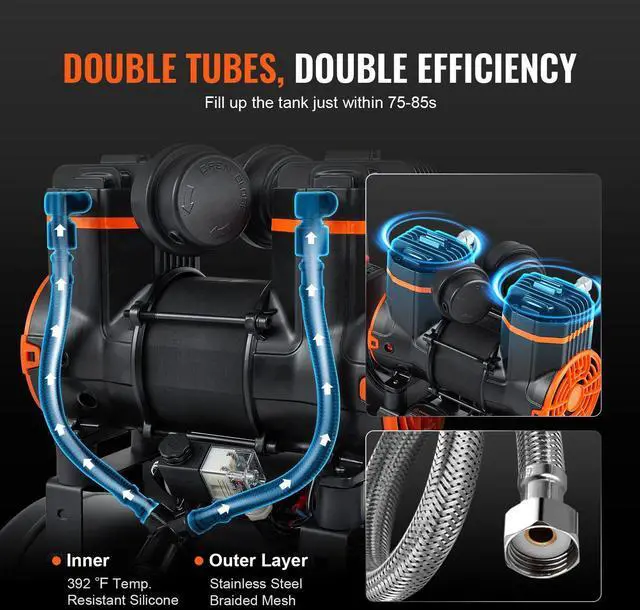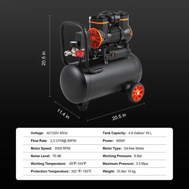 Protection Temperature: 302 / 150,Weight: 33 lbs/ 15 kg,Product Size: 20.5 x 11.4 x 20.5 in / 52 x 29 x 52 cm,Noise Level: 70 dB,Flow Rate: 2.2 CFM@ 90PSI,Tank Capacity: 4.8 Gallon/ 18 L,Motor Speed: 3500 RPM,Working Pressure: 87-116 PSI / 6-8 Bar,Maximum Bearing Pressure: 3.5 Mpa,Voltage: AC120V 60Hz,Motor Type: Oil-free Motor,Working Temperature: -59-104,Power: 1.2 HP / 900 W