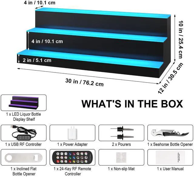 Power Cable Length: 4 ft / 1.2 m,Capacity: Around 24 Bottles,Model: 3 Layers 30 Inches,Material: Premium Acrylic,Control Methods: RF Remote Control & App Control,Control Range: 16-26 ft / 5-8 m,Item Weight: 11.5 lbs / 5.22 kg