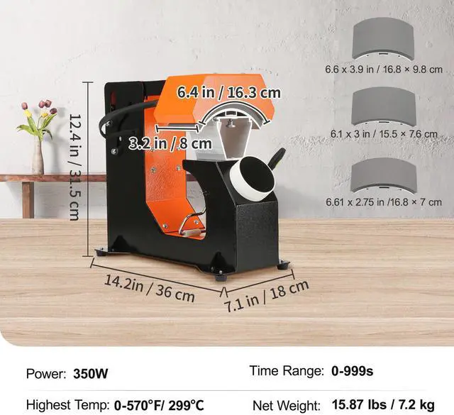 Time Range: 1 - 999s,Applicable Transfer Paper: Thermal Dye-sublimation Paper, HTV, and Vinyl,Hat Heating Pad #3: 6.1 x 3 in / 15.5 7.6 cm,Product Size: 14.17 x 7.08 x 12.4 in / 36 18 31.5 cm,Hat Heating Pad #2: 6.61 x 3.85 in / 16.8 9.8 cm,Applicable Hat Material: Nylon, Linen, Yarn, Cotton, Polyester, etc,Hat Heating Pad #1: 6.61 x 2.75 in / 16.8 7 cm,Press Material: Aviation Aluminum,Model: F136,Temperature Range: 40-210 / 104-410,Hat Heating Plate: 6.41 x 3.15 in / 16.3 8 cm,Net Weight: 15.87 lbs / 7.2 kg,Power: 350W 110V