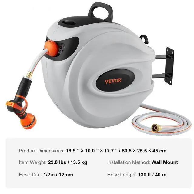 Installation Method: Wall Mount,Hose Dia.: 1/2 in/12 mm,Hose Length: 130 ft / 40 m,Product Dimensions: 19.9x 10.0x 17.7/ 50.5 x 25.5 x 45 cm,Item Weight: 29.8 lbs / 13.5 kg