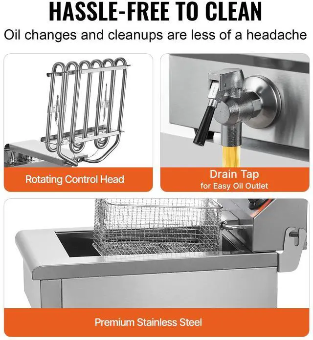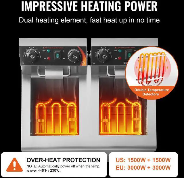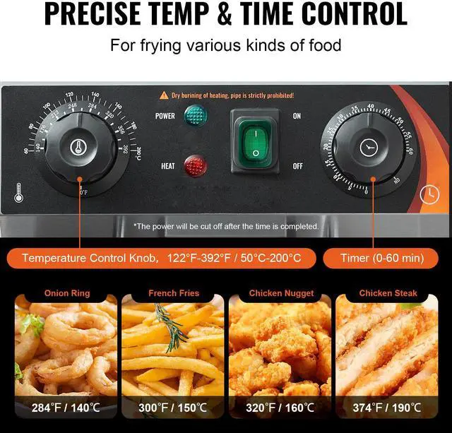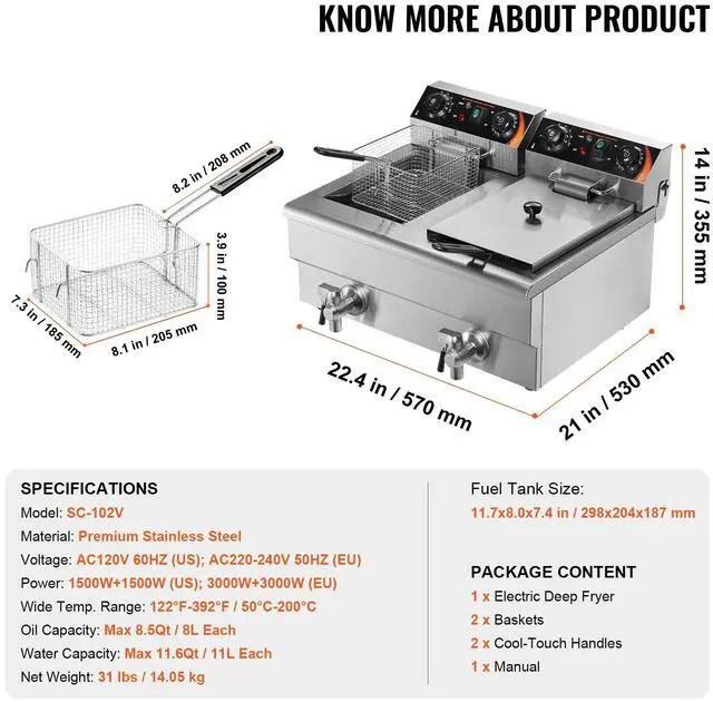 Power Cord Length: 59" / 1.5 m,Oil Tank Size: 11.7"x8.0"x7.4" / 298x204x187mm,Time Range: 0-60 min,Frying Basket Size: 7.3"x8.1"x3.9" / 185x205x100mm,Temperature Range: 122-392F / 50-200C,Heating Tube MaterialSUS 201:,Item Dimensions: 22.4"x20.5"x14.0" / 570x520x355mm,Length of Basket Handle: 8.2" / 208mm,Power: 1500W + 1500W,Item Weight: 30.4 lbs / 13.8 kg