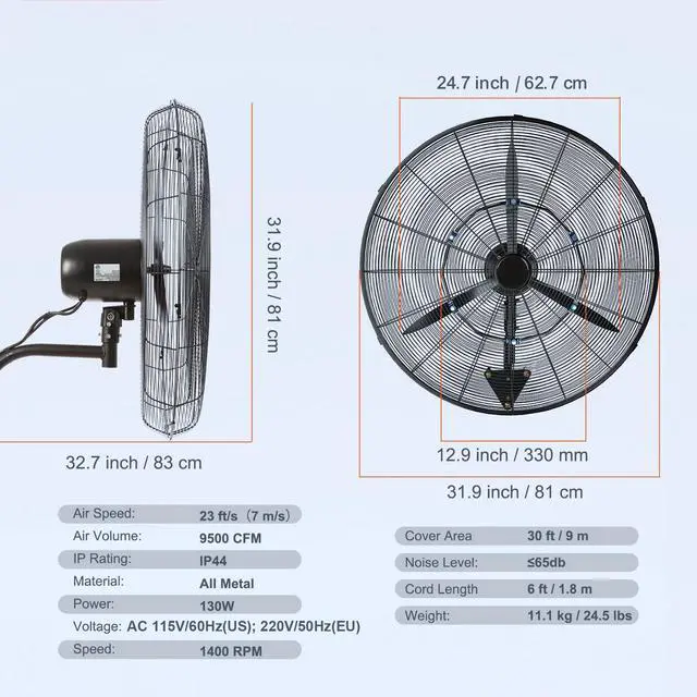 Noise Level: 65 dB,Speed: 1400 RPM,Air Speed: 23 ft/s (7 m/s),Air Volume: 6700/8150/9500 CFM,Cord Length: 6 ft / 1.8 m,Voltage: AC 115 V / 60 Hz,Model: VV-BGSFS30,Fan Blades Diameter: 29.5 inch / 74.9 cm,Cover Area: 30 ft / 9 m,Material: All Metal,Power: 150 W,Weight: 24.5 lbs / 11.1 kg