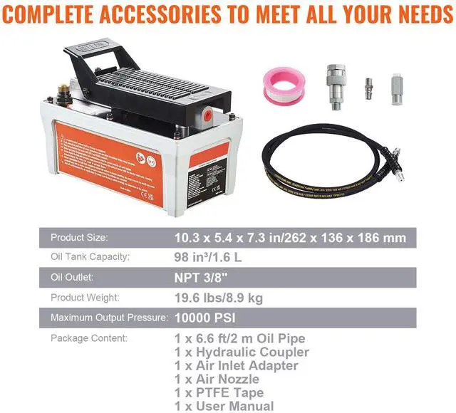 Hydraulic Pump Flow: 0.8 L/min (No-load); 0.16 L/min (Load),Input Air Pressure Range: 110 PSI-145 PSI,Product Size (L x W x H): 10.3 x 5.4 x 7.3 in/262 x 136 x 186 mm,Air Inlet: NPT 1/4",Model: NAP002,Product Weight: 19.6 lbs/8.9 kg,Oil Tank Capacity: 98 in/1.6 L,Maximum Output Pressure: 10,000 PSI,Oil Outlet: NPT 3/8"