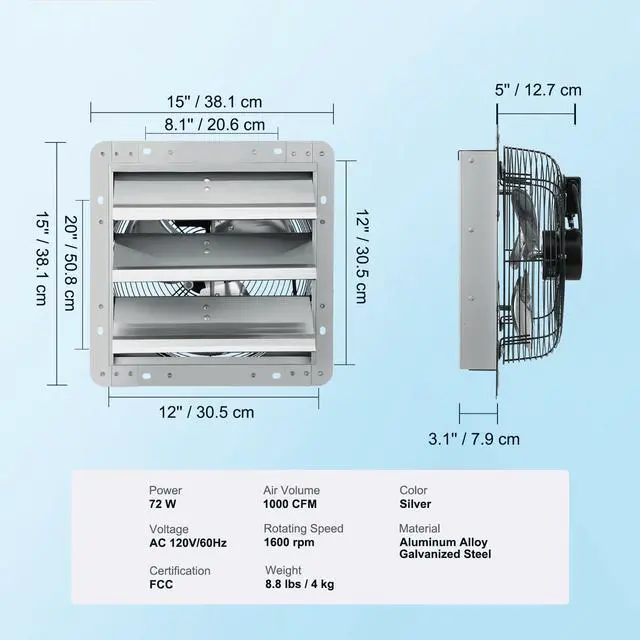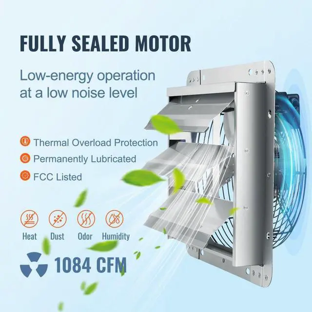 • VEVOR Shutter Exhaust Fan, 12'' with Speed Controller, AC-motor, 1000 CFM, No Assembly Required Wall Mount Attic Fan, Ventilation and Cooling for Greenhouses, Garages, Sheds, FCC Listed