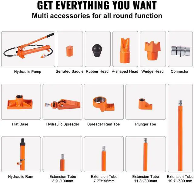 Stroke: 5.3 in/135 mm,Pump Size: 17.3 x 3.6 x 3.3 inch/440 x 92 x 85 mm,Cylinder Seal Ring Material: TPU,Spreader Capacity: 1/2 Ton,Weight: 55.1 lbs/25 kg,Toolbox Size: 22.8 x 12.6 x 6.8 inch/580 x 320 x 175 mm,Handle Length: 21.1 inch/535 mm,Extension Rod Size: 3.9 in/100 mm,7.7 in/195 mm, 11.8 in/300 mm, 19.7 in/500 mm,Oil Tube: 4.6 ft/1.4 m,Capacity: 10 Ton,Hydraulic Oil Type: HV15,Surface Treatment: Electrostatic Powder Spraying,Cylinder Material: Q235B,Main Material: QT450