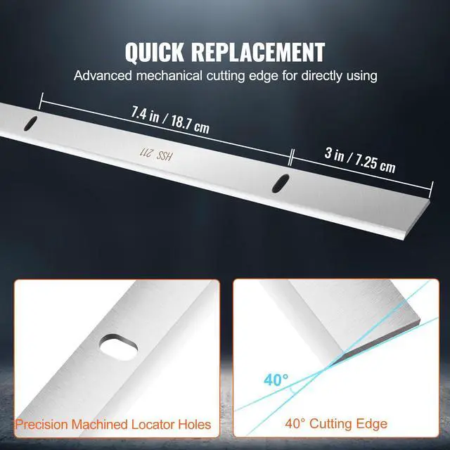Item Dimensions(L x W x H): 13 x 0.6 x 0.08 in / 33.1 x 1.65 x 0.2 cm,Type: Single Edge,Model: 13 Joiner Planer Knife,Bevel Angle: 40,Material: High-Speed Steel,Hole Diameter: 0.28 x 0.16 in / 0.7 x 0.4 cm,Center Distance of Two Holes: 7.4 in / 18.7 cm,Net Weight: 0.5 lbs / 0.2 kg,Suitable for: VEVOR 12.5 in & 13 in Planer