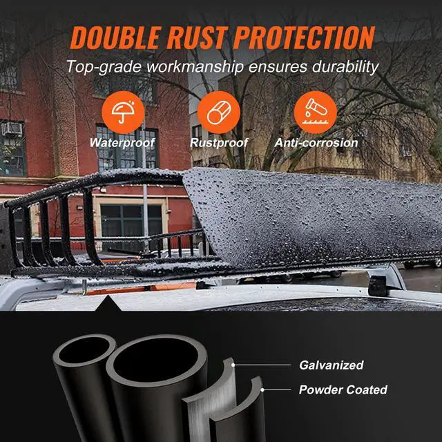 Surface Treatment Process: Spraying + Galvanizing,Steel Pipe Section Size: 0.98" x 0.87"/2522 mm (Thickness: 0.047"/1.2 mm),Luggage Bag Size: 44.68 x 34.45 x 16.9 inch/1135875430 mm,Material: Q195,Max. Capacity: 200 lbs/90.7 kg,Weight: 35.9 lb/16.3 kg,Product Size: 51365 inch/1305915127 mm,Structural Style: 2 Sections