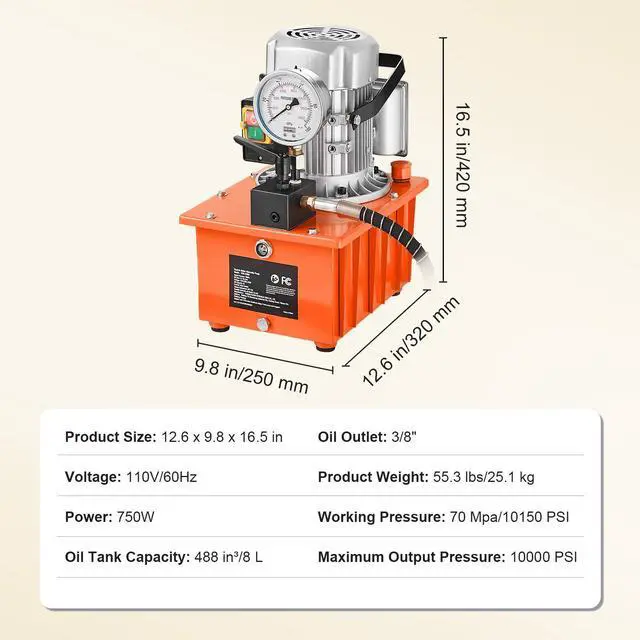 Product Size (L x W x H): 12.6 x 9.8 x 16.5 in/320 x 250 x 420 mm,Working Pressure: 70 Mpa/10150 PSI,Voltage: 110V/60Hz,Model: GYB-630B,Product Weight: 55.3 lbs/25.1 kg,Oil Tank Capacity: 488 in/8L,Low-pressure Flow: 8 L/min,Maximum Output Pressure: 10,000 PSI,High-pressure Flow: 0.7 L/min,Oil Outlet: NPT 3/8",Power: 750W