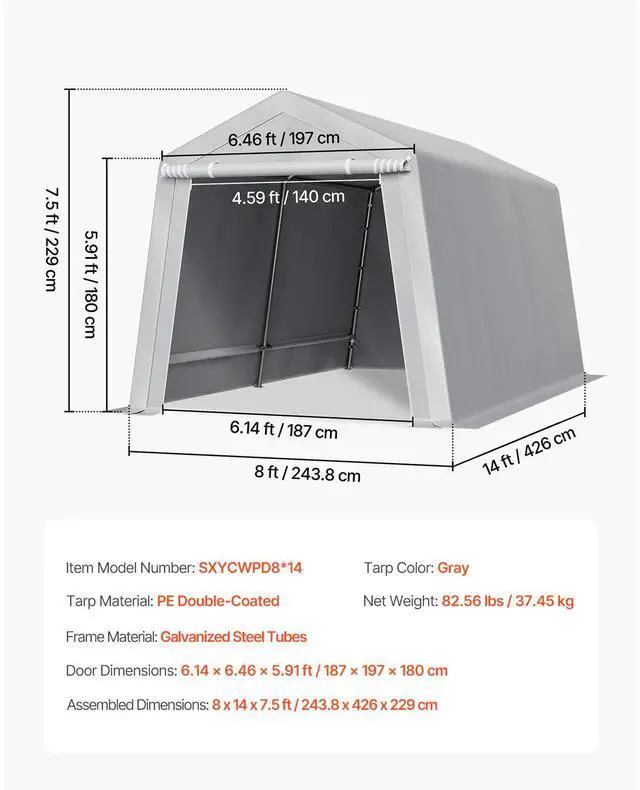 Storage Shed Color: Gray,Assembled Product Size: 8 x 14 x 7.6 ft / 243.8 x 426.7 x 231.6 cm,Tent Door Size: 6.7 x 4.7 x 6.1 ft / 205 x 142 x 185cm,Frame Material: Galvanized Steel Pipe,Interior Volume: 663.9 ft / 18.8 m,Net Weight: 87.7 lbs / 39.8 kg,Recommended Uses: Carport, Outdoor Storage,Shed Material: Double-sided Coating PE