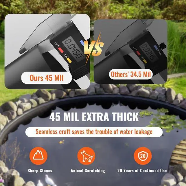 VEVOR Pond Liner, 10 x 15 ft 45 Mil Thickness, Pliable EPDM Material Pond Skins, Easy Cutting Underlayment for Fish or Koi Ponds, Water Features, Waterfall Base , Fountains, Water Gardens, Black