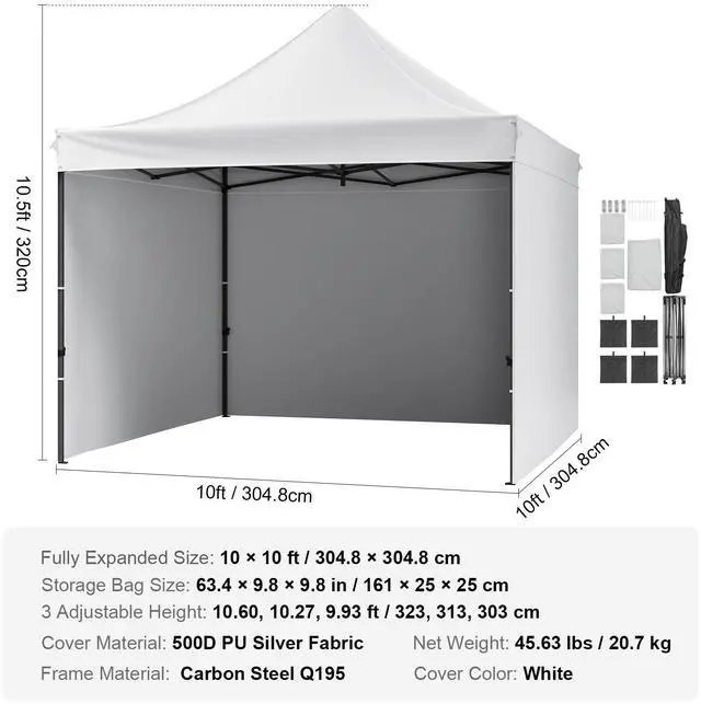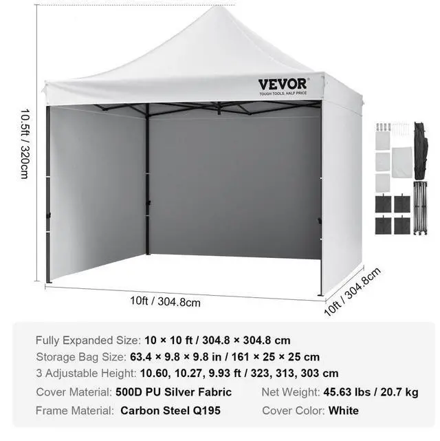 Cover Color: White,Cover Material: 500D PU Silver Fabric,Frame Material: Carbon Steel Q195,3 Adjustable Height: 9.84, 10.2, 10.5 FT / 300, 310, 320 cm,Fully Expanded Size: 10 x 10 FT / 304.8 x 304.8 cm,Net Weight: 48.1 lbs / 21.8 kg,Storage bag size: 63.4 x 9.8 x 9.8 in / 161 x 25 x 25 cm