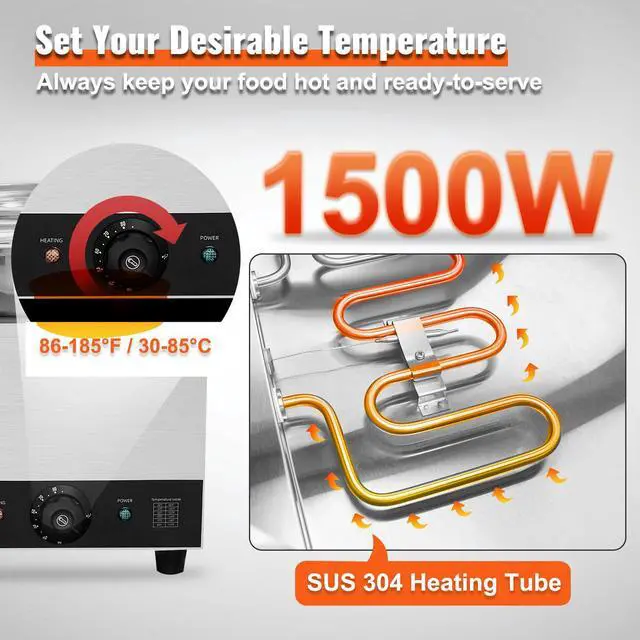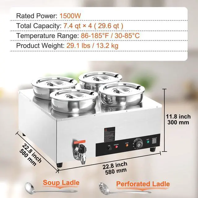 Soup Pot Size: 7.1"(bottom) x 9.4"(top) x 8.7"(height) / 180 x 240 x 220 mm,Total Capacity: 7.4 qt*4 (29.6 qt),Product Weight: 29.1 lbs / 13.2 kg,Temperature Range: 86-185F / 30-85C,Rated Power: 1500W,Product Dimensions: 22.8" x 22.8" x 11.8" / 580 x 580 x 300 mm
