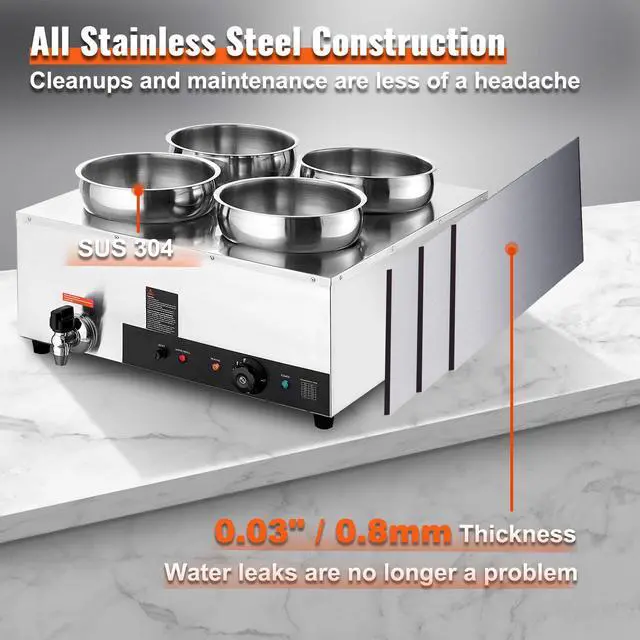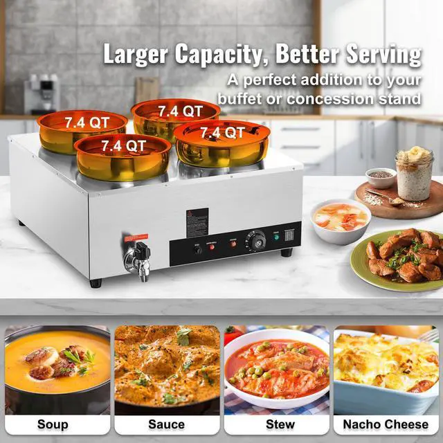VEVOR Electric Soup Warmer, Four 7.4QT Stainless Steel Round Pot 86~185F Adjustable Temp, 1500W Commercial Bain Marie with Anti-dry Burn and Reset Button, Soup Station for Restaurant, Buffet, Silver