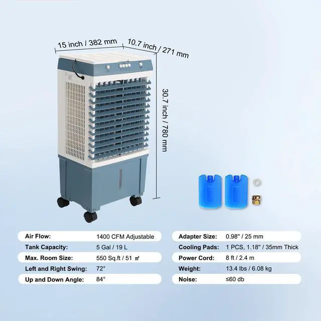 Air Flow: 1400 CFM Adjustable,Up and Down Angle: 84,Max. Room Size: 550 Sq.ft / 51 ,Noise: 60 db,Item Size (L x W x H): 15 x 10.7 x 30.7 in / 382 x 271 x 780 mm,Cooling Pads Thickness: 1.18'' / 35 mm,Weight: 13.4 lbs / 6.08 kg,Tank Capacity: 5 Gal / 19 L,Power Cord: 8 ft / 2.4 m,Adapter Size: 0.98'' / 25 mm,Item Model Number: JH-310J,Left and Right Swing: 72,Power: 60 W, 120 V / 60 Hz