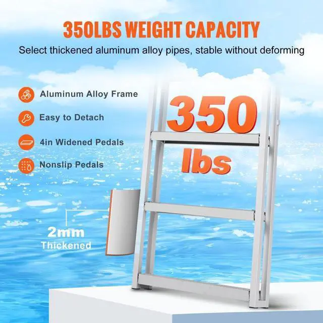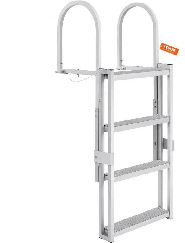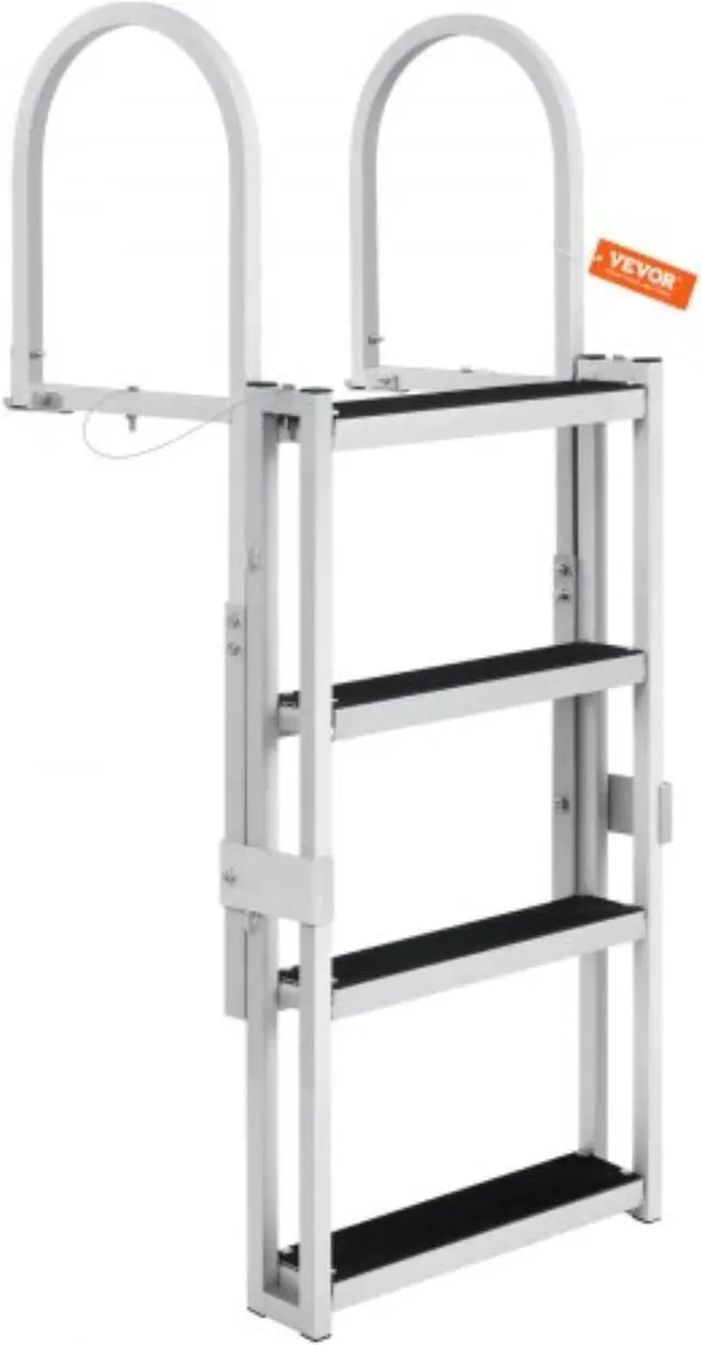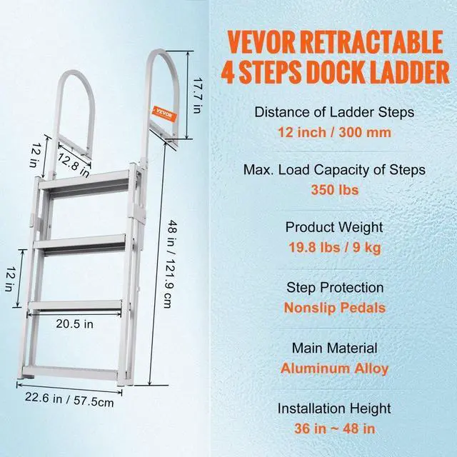 Package Dimensions: 42.7 x 18.7 x 4.7 inch / 1085 x 475 x 120 mm,Product Type: VEVOR Retractable 4 Steps Dock Ladder,Step Protection: Nonslip Rubber Pad,Product Weight: 19.8 lbs / 9 kg,Max. Load Capacity of Steps: 350 lbs,Product Dimensions: 18.3 x 23.8 x 55.1-67.1 inch / 465 x 605 x 1400-1705 mm,Distance of Ladder Steps: 12 inch / 300 mm,Main Material: Aluminum Alloy