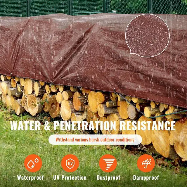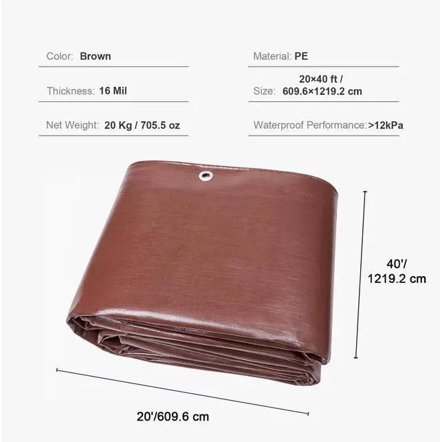 Thickness: 16 Mil,Size: 20 x 40 ft / 365.76 x 1219.2 cm,Color: Brown,Waterproof Performance: >12kPa,Material: Polyethylene,Grommet Material: Aluminum,Net Weight: 44 lbs / 20 kg,Weave Count: 16 x 16