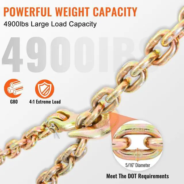 Product Surface Treatment: Galvanized, Color,Product Weight: 20.3 lbs / 9.2 kg3%,Secure Load: 4900 lbs,Chain Length: 20 ft,Main Material: Manganese Steel, G80,Chain Diameter: 5/16 inch