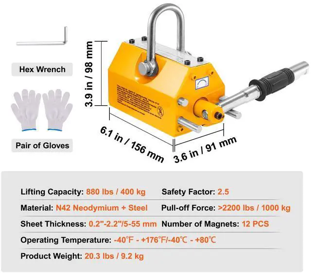 Operating Temperature: -40 - +176/-40 - +80,Pull-off Force: >2200 lbs/1000 kg,Base Size (L x W x H): 6.1" x 3.6" x 3.9"/156 x 91 x 98 mm,Lifting Capacity: 880 lbs/400 kg,Item Model Number: PML-400,Product Weight: 20.3 lbs/9.2 kg,Safety Factor: 2.5,Material: N42 Neodymium + Steel,Sheet Thickness: 0.2"-2.2"/5-55 mm,Number of Magnets: 12 PCS,Certification: CE