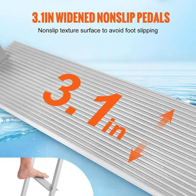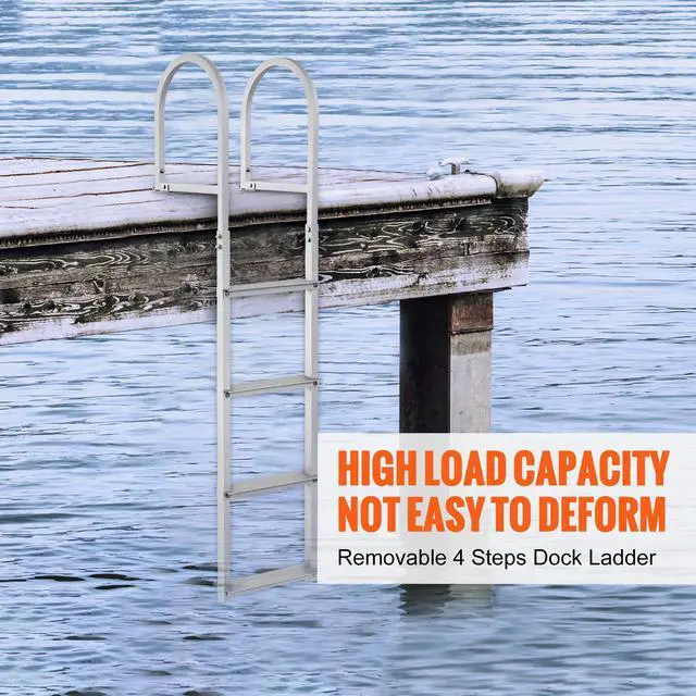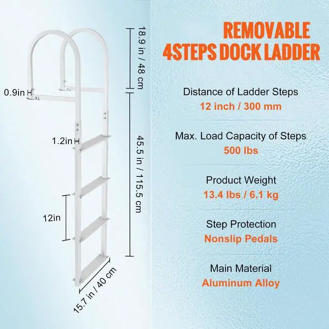 Package Dimensions: 45.9 x 16.1 x 3.7 inch / 1165 x 410 x 95 mm,Product Type: VEVOR Removable 4 Steps Dock Ladder,Step Protection: Nonslip Rubber Pad,Product Weight: 13.4 lbs / 6.1 kg,Max. Load Capacity of Steps: 500 lbs,Product Dimensions: 15.7 x 16.2 x 64.4 inch / 400 x 412 x 1635 mm,Distance of Ladder Steps: 12 inch / 300 mm,Main Material: Aluminum Alloy
