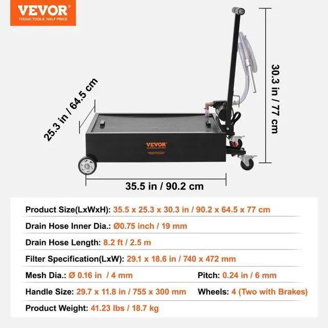 Mesh Dia.: 0.16 inch/4 mm,Handle Size: 29.7"x11.8"/755x300 mm,Capacity: 15 Gallon,Wheels: 4 (Two with Brakes),Pump Power: 180 W,Pitch: 0.24 inch/6 mm,Product Weight: 41.23 lbs/18.7 kg,Material: Carbon Steel,Product Size(LxWxH): 35.5"x25.4"x30.3"/902x645x770 mm,Drain Hose Length: 8.2 ft/2.5 m,Filter Specification(LxW): 29.1"x18.6"/740x472 mm,Drain Hose Inner Dia.: 0.75 inch/19 mm