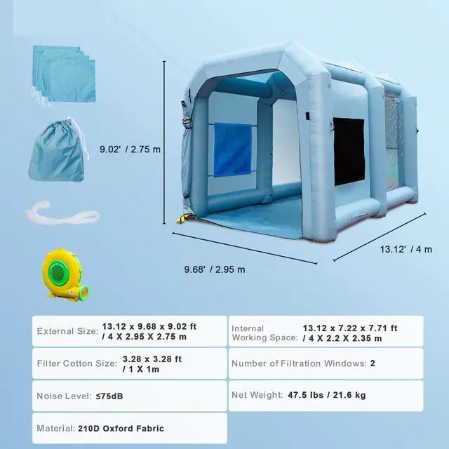 Noise Level: 75dB,Number of Filtration Windows: 6,Color: Blue,Item Model Number: YJSSX04,Filter Cotton Size: 6.56 x 3.28 ft / 2 x 1 m,Material: 210D Oxford Fabric,External Size: 13.12 x 9.67 x 9 ft / 4 x 2.95 x 2.75 m,Net Weight: 47.62 lbs / 21.6 kg,Internal Working Space: 13.12 x 7.22 x 7.7 ft / 4 x 2.2 x 2.35 m
