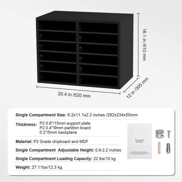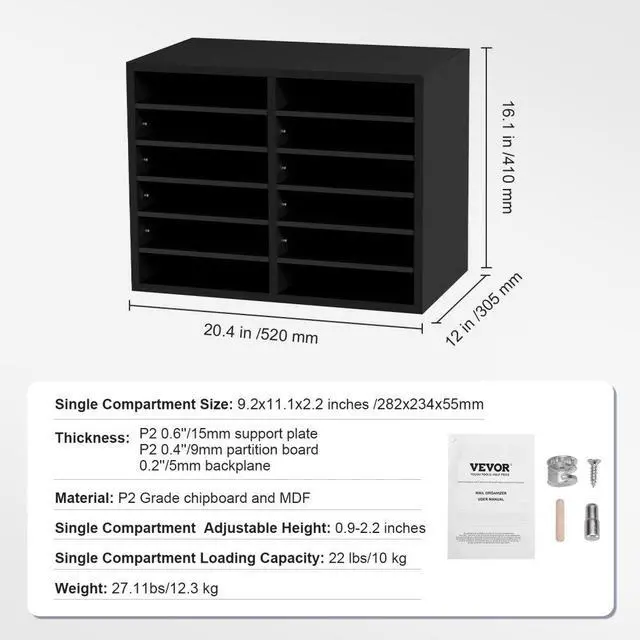 VEVOR Wood Literature Organizer, 12 Compartments, File Sorter with Removable Shelves, Mailboxes Slot for Office Home Classroom Mailrooms Organization, EPA Certified, Black