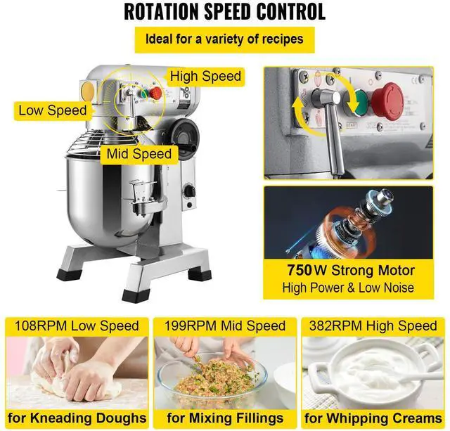 Body Material: Carbon Steel,Model: B20-BT,Adjustable Speeds: 108/199/382 RPM,Product Weight: 160.9 lbs / 73 kg,Mixing Parts Material: 304 Stainless Steel,Bowl Dimensions: 12.5 x 12.5 x 11.4 inch / 31.8 x 31.8 x 29 cm,Product Dimensions: 21.1 x 16.7 x 30.7 inch / 53.5 x 42.5 x 78 cm,Power: 750W,Bowl Capacity: 20Qt