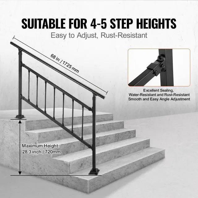 Fitting Steps: 1-4,Item Height: 33''/ 83.5 cm,Model: VV-OSRLG-4,Max. Height for Steps: 26.7''/ 67.8 cm,Material: Wrought Iron,Adjustable Angle: 0-50,Item Width: 68'' / 172.5 cm