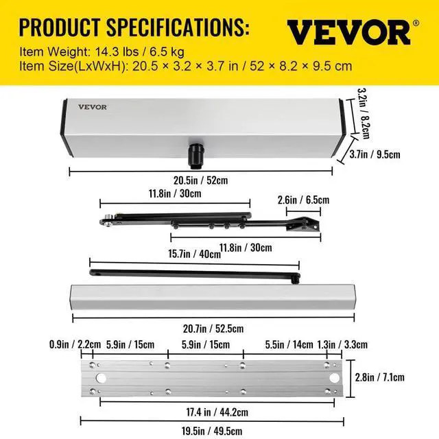 Motor: DC 24 V Brushless Motor,Opening Time: 3-7 s,Environment Temperature: -4-122 °F/ -20-50 °C,Max. Door Frame Depth: 17.7 in/ 45 cm,Max. Door Weight: 220 lbs/ 100 kg,Voltage: 100-240 VAC +/-10%,Model: VV-LBKMJ-450,Suggested Opening Angle: 90°,Max. Opening Angle: 120°,Door Width: 21.6-47 in/ 55-120 cm,Power Consumption: 50 W,Item Size(L x W x H): 20.5 x 3.2 x 3.7 in/ 52 x 8.2 x 9.5 cm,Hold Open Time: 1-30 s