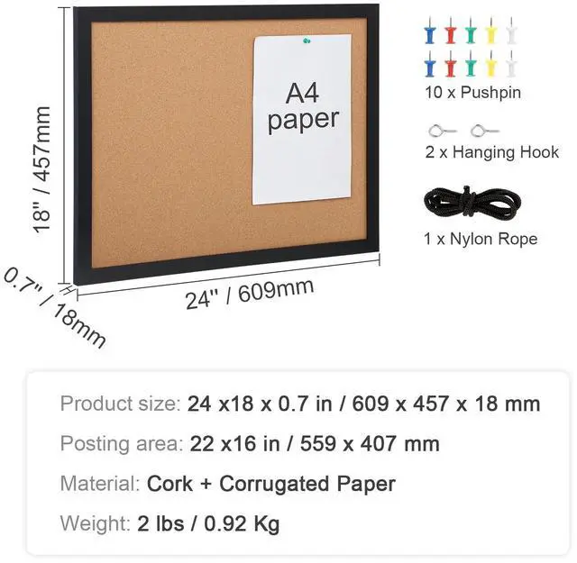 Size: 18x24x 0.7 in/457x609x18mm Posting Area: 16x22 in/407x559mm Material: Cork + Corrugated Paper Weight: 2 lbs/ 0.92 kg