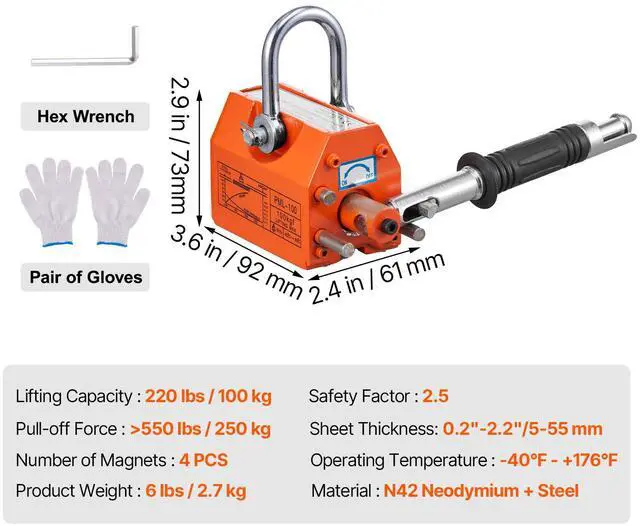 Operating Temperature: -40 - +176/-40 - +80,Pull-off Force: >550 lbs/250 kg,Base Size (L x W x H): 3.6" x 2.4" x 2.9"/92 x 61 x 73 mm,Lifting Capacity: 220 lbs/100 kg,Item Model Number: PML-100,Product Weight: 6 lbs/2.7 kg,Safety Factor: 2.5,Material: N42 Neodymium + Steel,Sheet Thickness: 0.2"-2.2"/5-55 mm,Number of Magnets: 4 PCS,Certification: CE