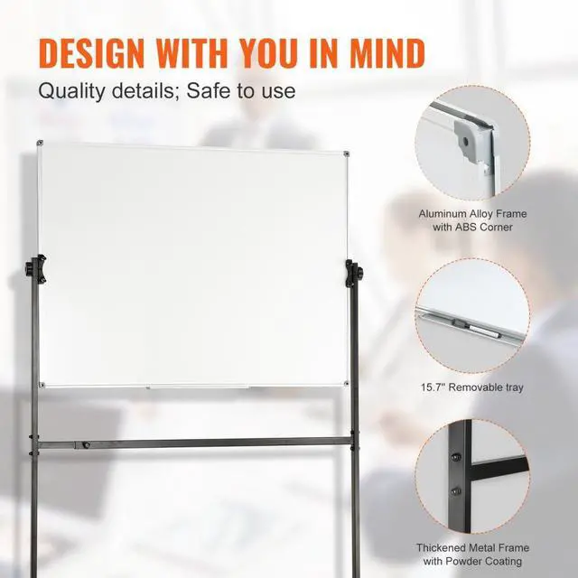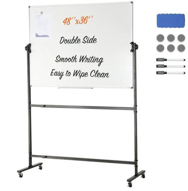 VEVOR Rolling Magnetic Whiteboard, Double-sided Mobile Whiteboard 48x36 Inches, Adjustable Height Dry Erase Board with Wheels, 1 Magnetic Erase & 3 Dry Erase Markers & Movable Tray for Office School