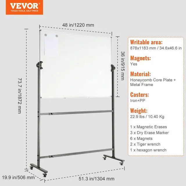 Casters: Iron+PP,Size: 1872x1304x506 mm/73.7x51.3x19.9 in,Writable Area: 878x1183mm/34.6x46.6 in,Whiteboard Area: 1220x915x18mm/48x36x0.7 in,Material: Honeycomb Core Plate + Metal Frame,Magnets: Yes,Weight: 22.9lbs/10.40 kg