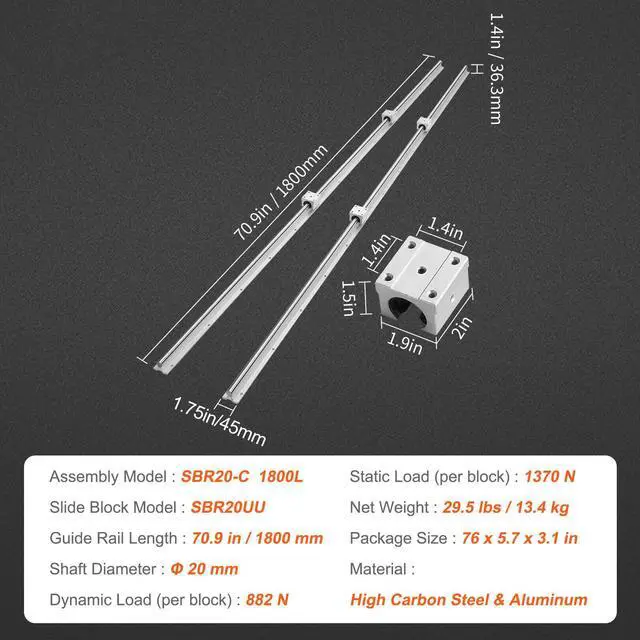 Shaft Diameter: 20 mm,Material: High Carbon Steel & Aluminum,Model Number: SBR20-C 1800L,Product Dimensions(L x W x H): 70.9 x 3.5 x 1.4 in/1800 x 90 x 36.3 mm,Package Size(L x W x H): 76 x 5.7 x 3.1 in/1930 x 145 x 80 mm,Dynamic Load (per block): 882 N,Mounting Hole Distance B: 1.4 in/35 mm,Mounting Hole Distance A: 1.4 in/35 mm,Slide Block Size(L x W x H): 2 x 1.9 x 1.5 in/50 x 48 x 39 mm,Static Load (per block): 1370 N,Slide Block Model: SBR20UU,Net Weight: 29.5 lbs/13.4 kg,Guide Rail Length: 70.9 in/1800 mm