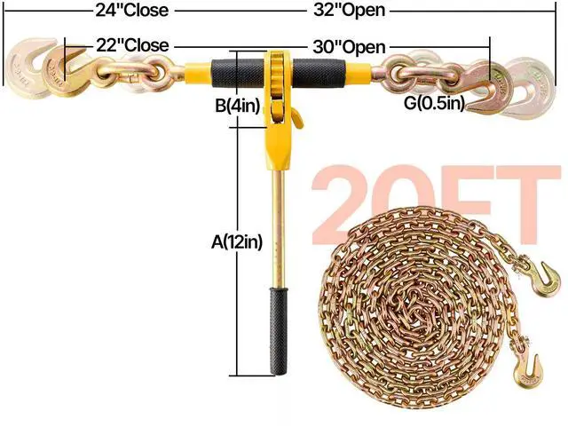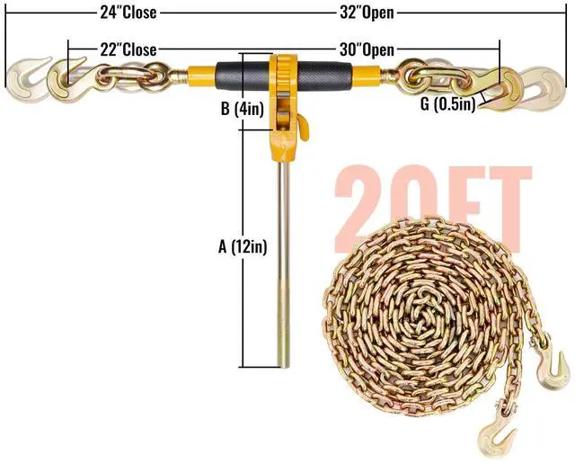 Handle Installation Length: 15 in / 39 cm,Min. Loosening Size: 22.6 in / 57.5 cm,Chain Size: 5/16 in - 3/8 in / 0.8 - 0.9 cm,Package Dimensions (L x W x H): 17 x 17 x 10 in / 44 x 44 x 26 cm,Max. Load of Chain: 4700 lbs / 2131 kg,Adapting Model: 5/16 in - 3/8 in / 0.8 - 0.9 cm,Max. Loosening Size: 30.5 in / 77.5 cm,Certification: CE, CVSA, DOT, NACM, FMCSA,Item Model Number: 5/16-3/8 Chain Binders,Pawl Structure: External Adjusting Handle,Max. Load of Ratchet Binder: 7100 lbs / 3220 kg,Net Weight: 119 lbs / 54 kg,Main Material: 45# Cast Steel