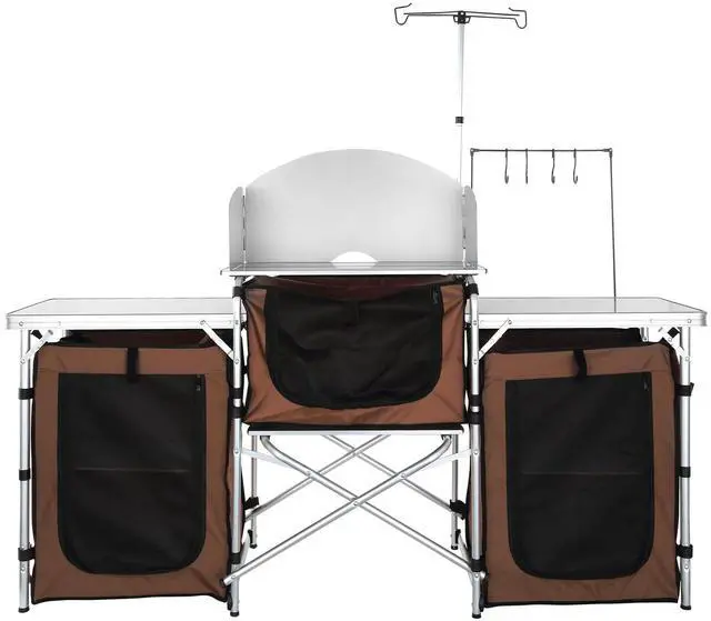 VEVOR Camping Kitchen Table, Folding Outdoor Cooking Table with Storage Carrying Bag, Aluminum Cook Station 3 Cupboard & Detachable Windscreen, Quick Set-up for Picnics, BBQ, RV Traveling, Brown